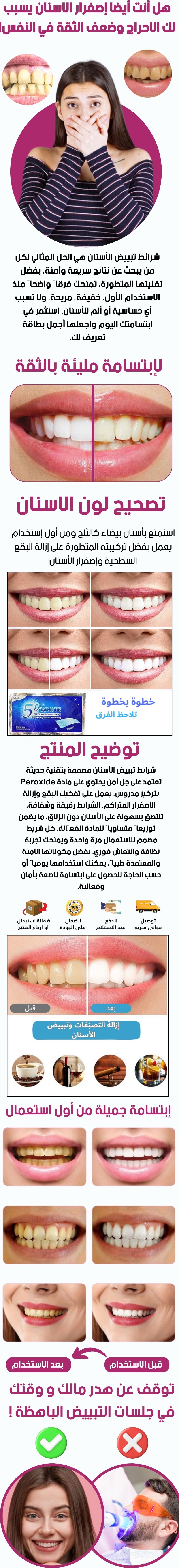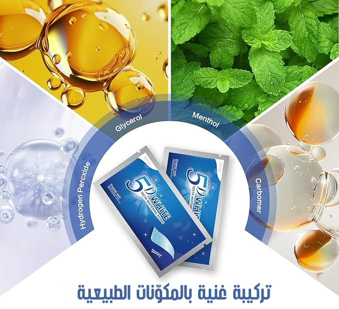 شرائط تبييض الأسنان المنزلية تمنحك ابتسامة مشرقة بسهولة وأمان. العلبة تحتوي على 28 شريط تكفي أسبوعين، بتركيبة معتمدة من Hydrogen Peroxide بتركيز آمن. الشرائط شفافة وغير ملحوظة أثناء الاستعمال، وتحتاج فقط من 20 إلى 30 دقيقة يومياً. ستلاحظ الفرق في درجة البياض ابتداءً من الأسبوع الأول، وهي مناسبة لجميع أنواع الأسنان ولا تسبب حساسية للثة.